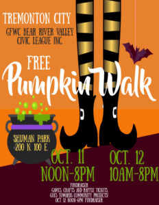 The 4th Annual GFWC Women’s Civic League Pumpkin Walk in Tremonton will be Friday, October 10 from Noon-8 pm and Saturday, October 7 from 10 am-8 pm at Shuman Park, 200 N. Tremont St. in Tremonton. Admission is free.We need families, businesses, and organizations to sign up to build scenes and decorate pumpkins. There is no charge to build a scene or donate decorated pumpkins. Pumpkins must be lit with batteries, solar lights, or a generator, no flames. Candy, coupons, etc may be handed out during the Pumpkin Walk if you would like. Please email grammamuggs@gmail.com for more info or to sign up.