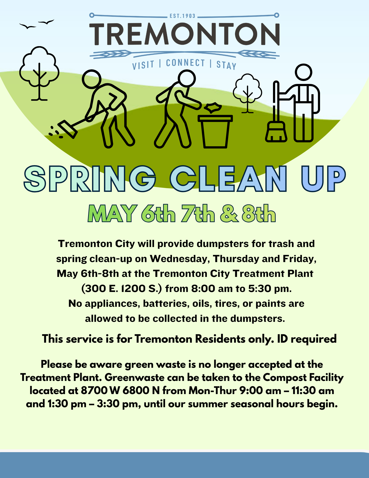 Tremonton City will provide dumpsters for trash and spring clean-up on Wednesday, Thursday, and Friday, May 6th through 8th from 8:00 am to 5:30 pm at the Tremonton City Treatment Plant (300 E 1200 S.). No appliances, batteries, oils, tires, or paints are allowed to be collected in the dumpsters. This service is for Tremonton [...]
