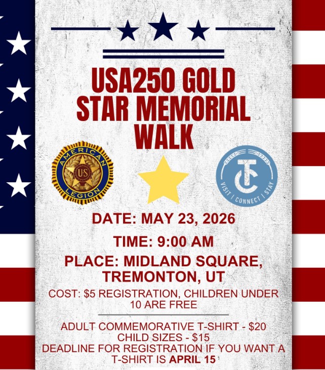 Registration: USA250 Gold Start Memorial Walk Join Tremonton City and the American Legion on May 23 at 9:00 AM for the Gold Star Family Walk, honoring families who have lost a loved one while serving on active duty. This walk is not only for Gold Star families, but for the entire community to show support, [...]